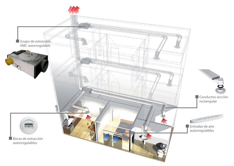 Sistema concebido para la extracción individual de aire viciado y renovación en las viviendas de los edificios plurifamiliares.